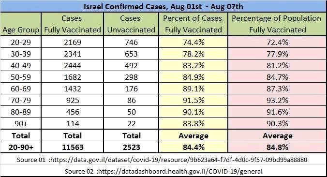 La tabella dice che in Israele Sars-CoV2 infetta in modo identico completamente vaccinati e non vaccinati.